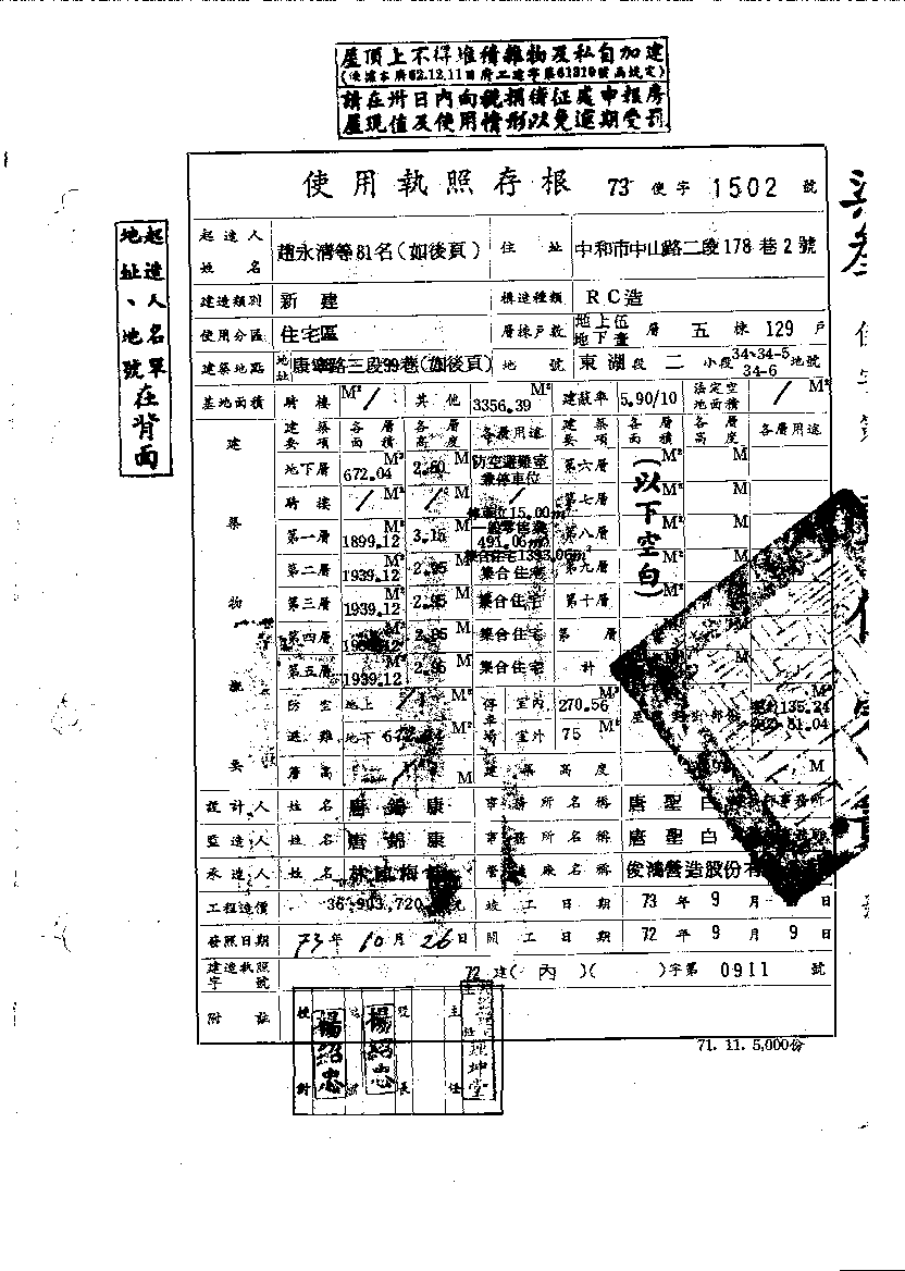 - 備註說明:使用執照存根附表
