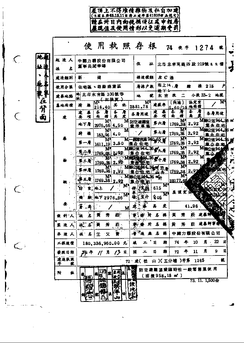 - 備註說明:使用執照存根附表