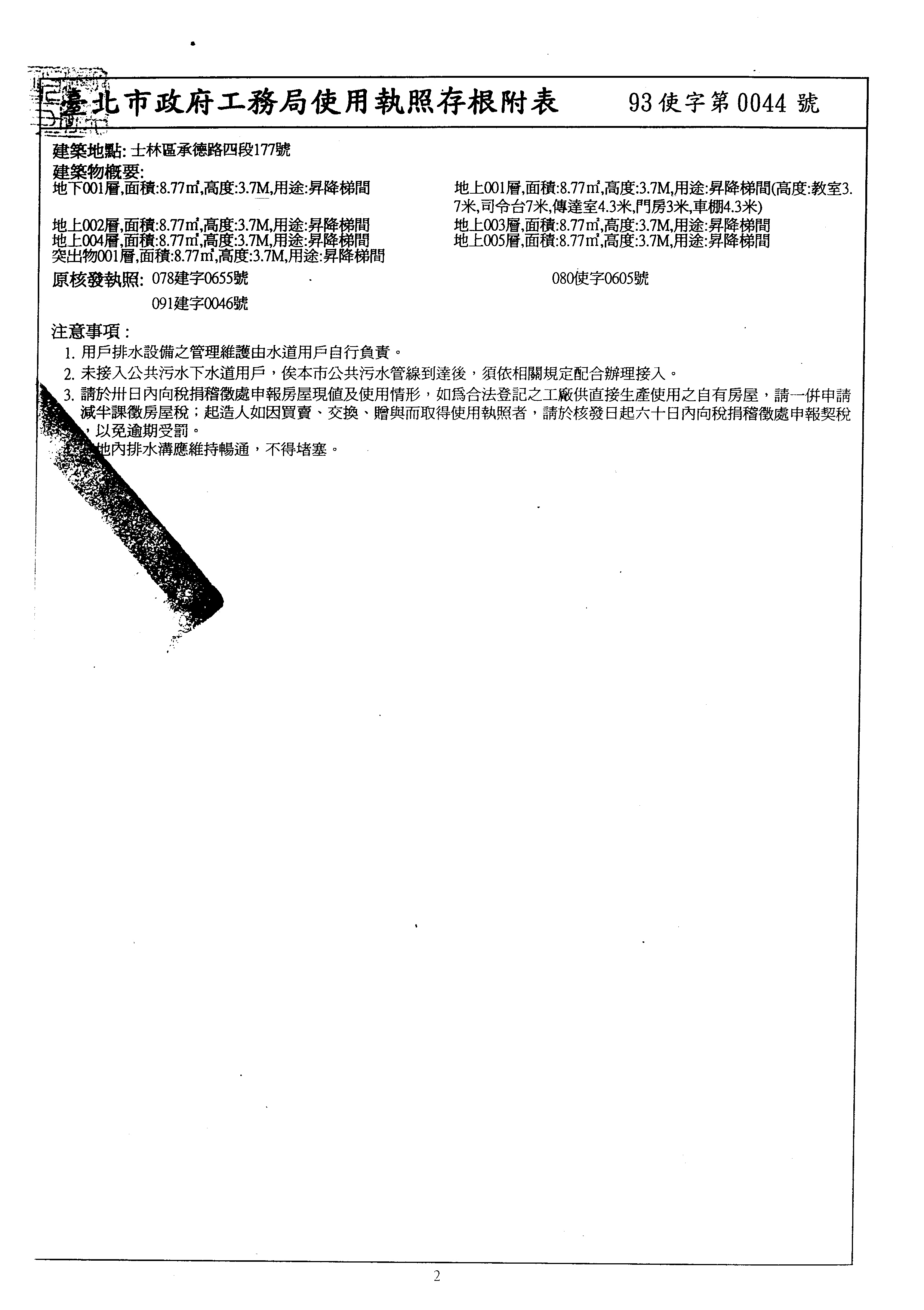 備註說明:使用執照存根附表